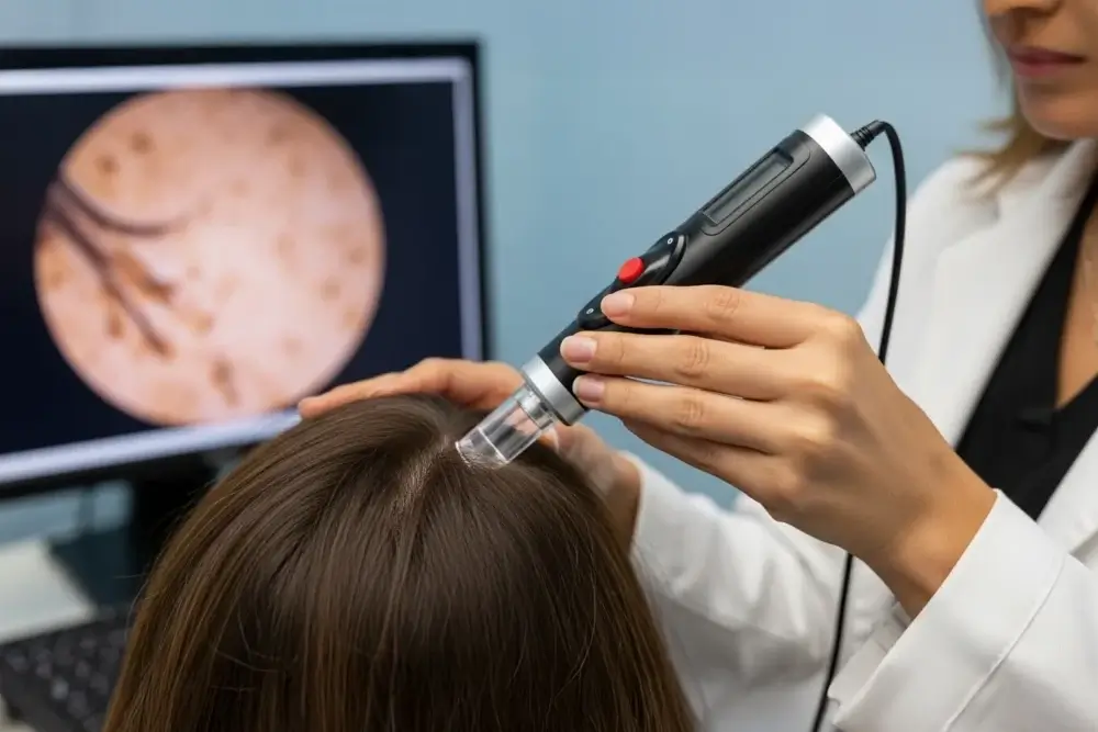 A tricoscopia é um exame detalhado do couro cabeludo e dos fios realizado com dermatoscópio, permitindo avaliar estrutura, inflamação, miniaturização e padrões de queda. Auxilia no diagnóstico preciso de alopecias, micoses e dermatites, orientando tratamentos personalizados e acompanhamento eficaz.